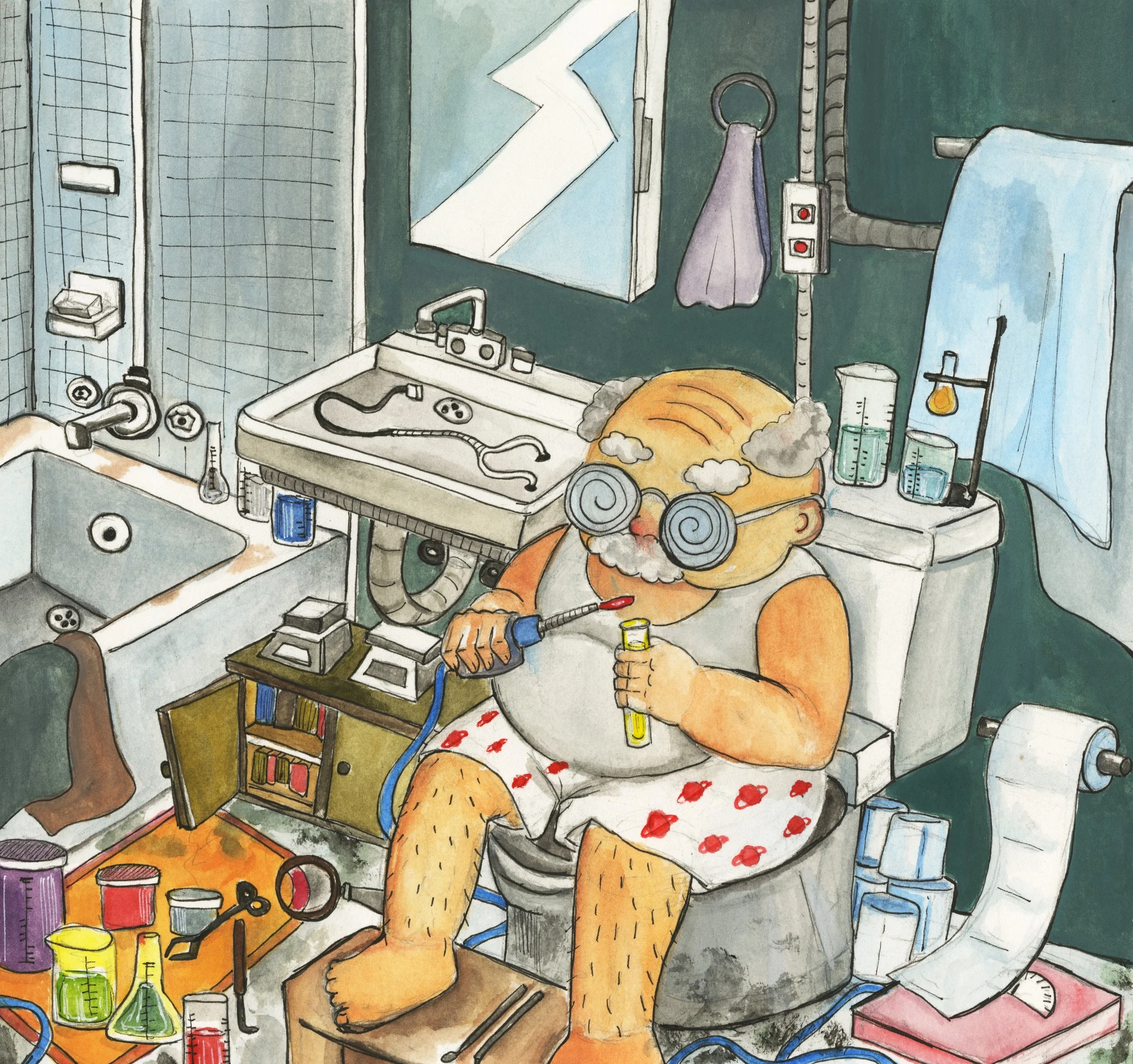 The Scientist is conducting his experiment in his bathroom, which is very unusual! Even though it is unusual, it is quite funny and peculiar as he creates his inventions in this little space. Enjoy this slice of life moment of The Scientist’s daily life.